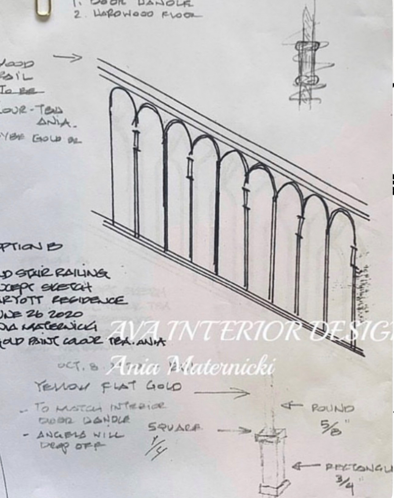 This staircase transformation is a perfect example of how my design process works at AVA INTERIOR DESIGN. What you see in the completed “after” photo started as a hand-drawn sketch at my desk, followed by in-depth conversations with both the homeowners and trusted trades. Every line on paper represented intention: proportion, safety, flow, and beauty.